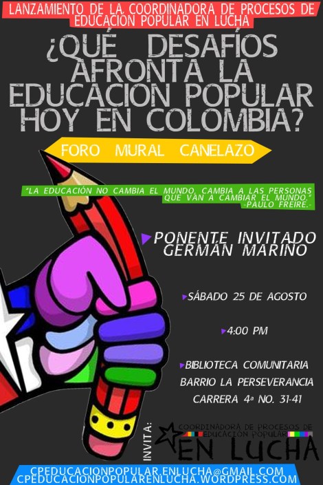 En esta oportunidad presentaremos a la coordinadora, así como a los diferentes Pre Icfes y Pre Universitarios Populares que la conforman, también nos encontraremos para debatir sobre los desafíos y apuestas de la Educación Popular en Colombia, contando con la participación de Germán Mariño de Dimensión Educativa. Cerraremos con una olla comunitaria y un mural.