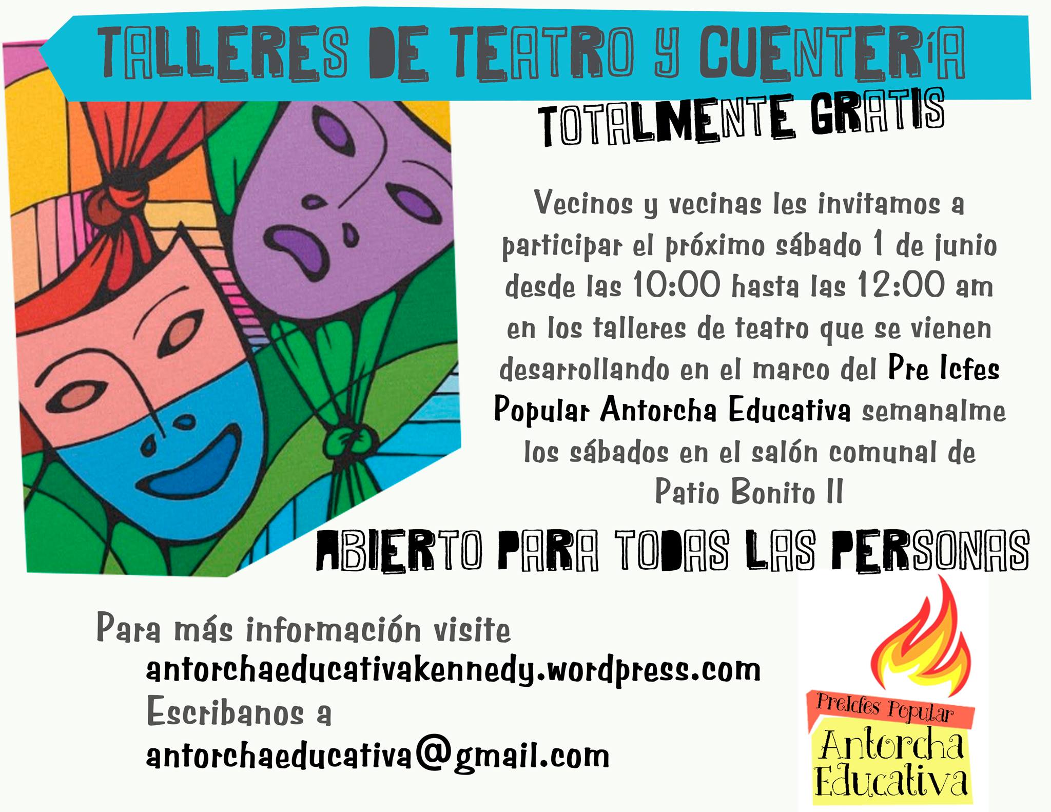 Talleres Libres Pre Icfes Popular (PIP) de Kennedy mayo 31, 2013 · de cpeducacionpopularenlucha · en Uncategorized. · Talleres Libre Pre Icfes Popular (PIP) de Kennedy Teatro y Cuentería Sábado 1 de junio de 10 a.m a 12 p.m. Salón Comunal Patio Bonito II Sector Comparte esto: Haz clic para compartir en X (Se abre en una ventana nueva) X Haz clic para compartir en Facebook (Se abre en una ventana nueva) Facebook Me gusta Cargando... Relacionado