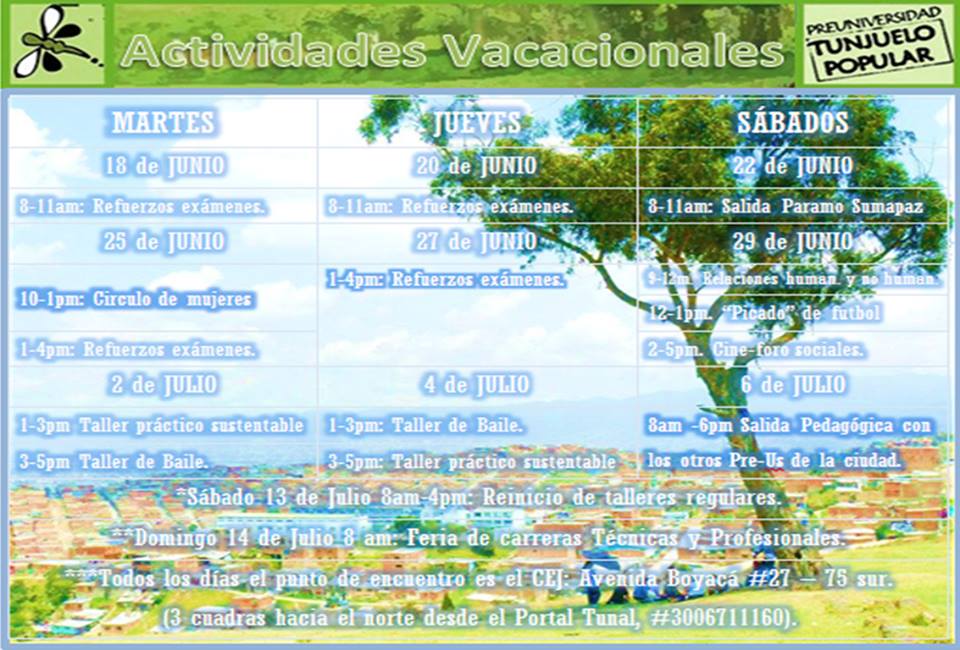 Cronograma de Actividades Vacacionales Pre Universidad Tunjuelo Popular junio 17, 2013 · de cpeducacionpopularenlucha · en Uncategorized. · Comparte esto: Haz clic para compartir en X (Se abre en una ventana nueva) X Haz clic para compartir en Facebook (Se abre en una ventana nueva) Facebook Me gusta Cargando... Relacionado