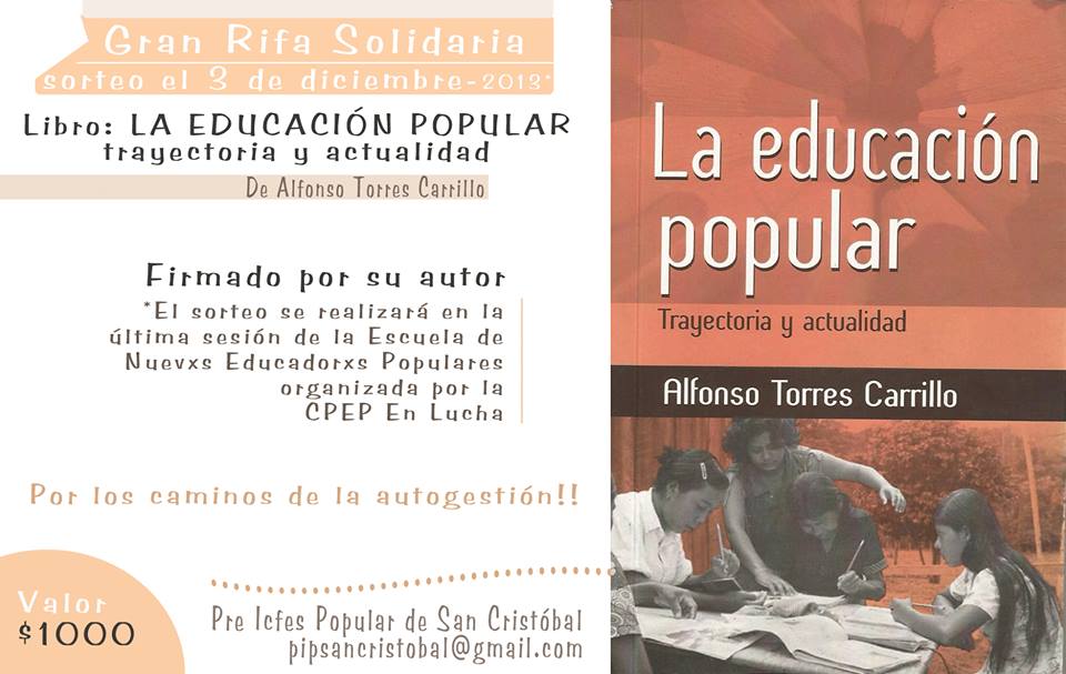 El Pre Icfes Popular de San Cristóbal te invita a participar en la gran rifa solidaria del libro «Educación Popular. Trayectoria y actualidad» (con una dedicatoria especial de su autor, Alfonso Torres). Puedes solicitar las boletas a través de un inbox a nuestro Facebook (https://www.facebook.com/preicfes.sancristobal?fref=ts). El sorteo se realizará el 3 de diciembre en la Escuela de Nuevos educadores Populares, organizada por la Coordinadora De Procesos De EP En Lucha. Si el ganador no asiste al evento, se le entregará el premio de todos modos. Ayúdanos a seguir por los caminos de la autogestión
