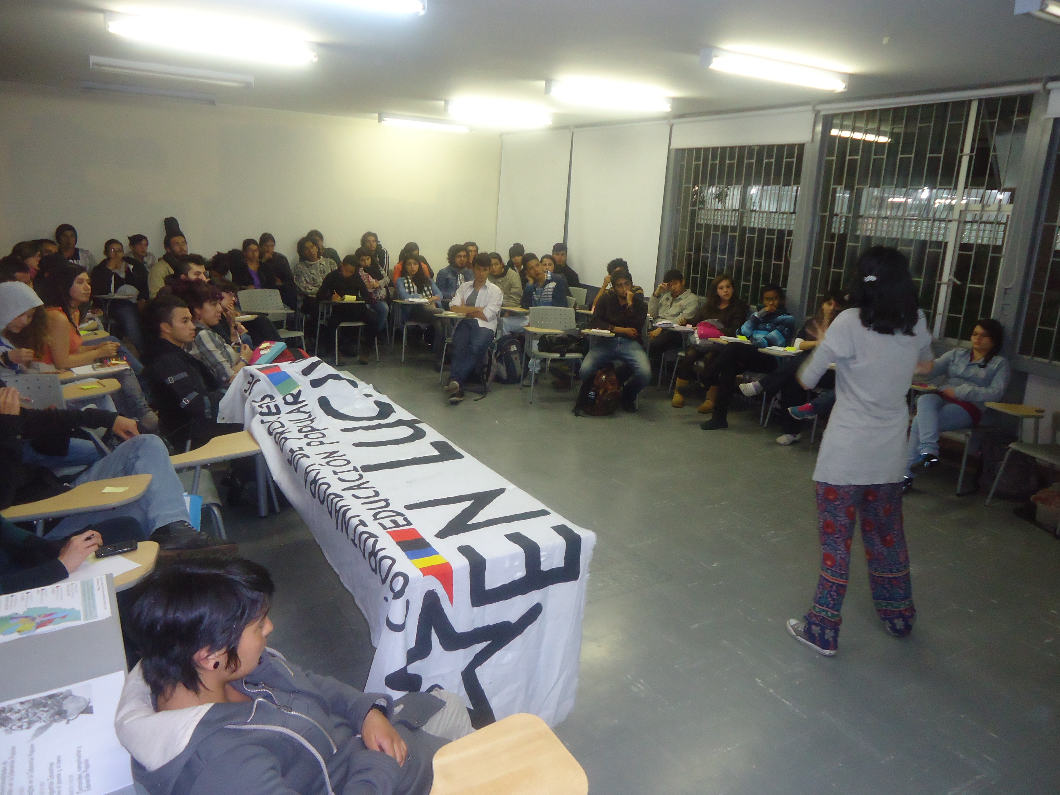 En concreto los temas que hemos preseleccionado y organizado en un cronograma son los siguientes: Hoy martes 19 de noviembre: Pre Icfes y Pre U Populares, Educación Popular y su Historia. El siguiente encuentro será el jueves 21 de noviembre: Apuestas e Intencionalidades de transformación en la Educación Popular. Los siguientes, alternando martes y jueves, tendremos: Metodologías en la Educación Popular, Autogestión Educativa: Entre el pensar y el hacer, y por último Contenidos, competencias y Educación Popular. Todas de DE 6 A 8PM en la Universidad Nacional de Colombia, en el Salón 114 – Edificio Aulas de Ciencias Humanas (212), lugar en el que nos encontramos. Hecha la invitación, iniciamos con el taller Pre Icfes y Pre U Populares, Educación Popular y su Historia.”