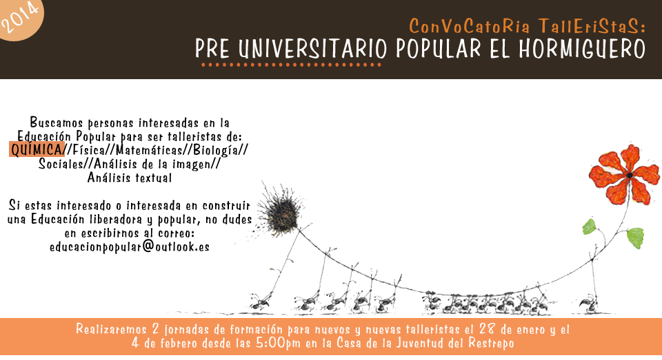 Convocatoria Talleristas – Pre Universitario Popular El Hormiguero enero 14, 2014 · de cpeducacionpopularenlucha · en Uncategorized. · Para las interesadas (os) en participar como talleristas. Si estás interesada (o) en construir, con nosotrxs, educación liberadora y popular, no dudes en escribirnos. Comparte esto: Haz clic para compartir en X (Se abre en una ventana nueva) X Haz clic para compartir en Facebook (Se abre en una ventana nueva) Facebook Me gusta Cargando... Relacionado