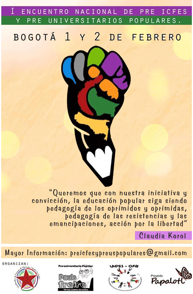 Quisiéramos invitarlas e invitarlos a ser participes del Primer Encuentro Nacional de Pre Icfes y Pre Universitario Populares, que se llevará a cabo en la ciudad de Bogotá, el próximo sábado 1 y domingo 2 de febrero en instalaciones aún por confirmar. Esta es una iniciativa en cuya construcción hemos participado desde hace un trimestre Pre Icfes y Pre Universitarios identificados con el proyecto de la Educación Popular de las ciudades de Bogotá, Medellín y Popayán, y que pretende, entre otras cosas, generar espacios de discusión, intercambio de experiencias y construcción colectiva que nos permitan articular y potenciar nuestras apuestas político-pedagógicas.
