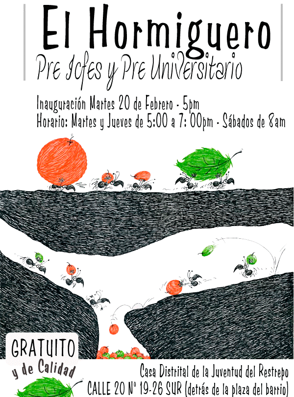 Inscripciones Abiertas Pre Icfes y Pre Universitario El Hormiguero febrero 8, 2014 · de cpeducacionpopularenlucha · en Uncategorized. · Si deseas hacer parte diligencia el siguiente formulario: http://bit.ly/1bFM6d8. Para mas información: educacionpopular@outlook.es Comparte esto: Haz clic para compartir en X (Se abre en una ventana nueva) X Haz clic para compartir en Facebook (Se abre en una ventana nueva) Facebook Me gusta Cargando... Relacionado
