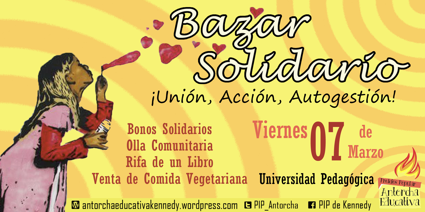 «La caridad es humillante porque se ejerce verticalmente y desde arriba; la solidaridad es horizontal e implica respetuo mutuo.» -Eduardo Galeano-Desde el grupo de talleristas del Pre Icfes Popular Antorcha Educativa de Kennedy, les queremos invitar a este primer bazar solidario que realizaremos el 07 de marzo en la Universidad Pedagógica Nacional.