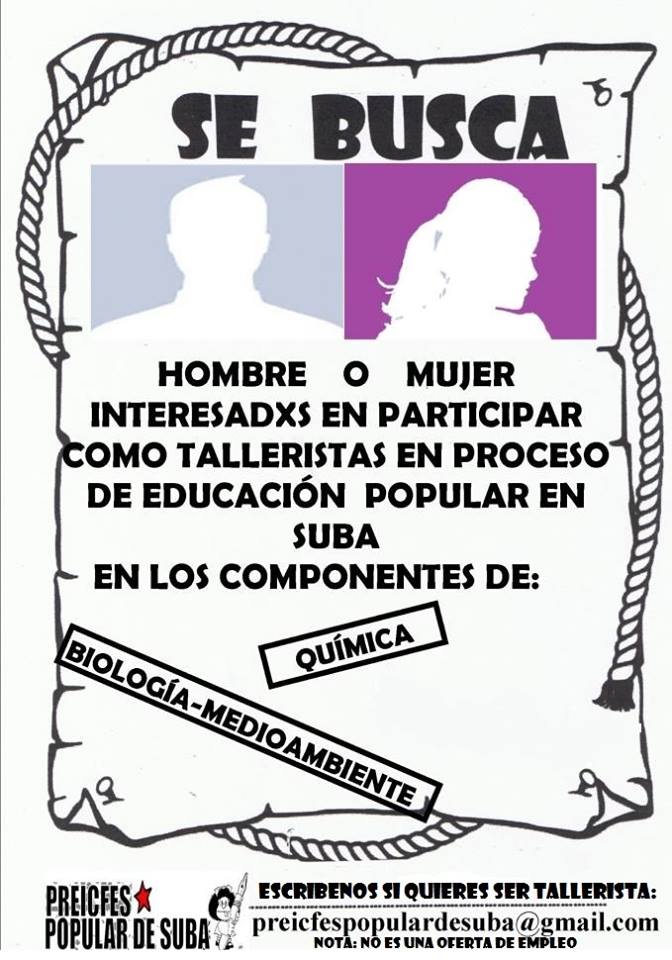 Escríbenos si quieres ser tallerista de: Química, Biología/Medio Ambiente al Correo Electrónico: preicfespopulardesuba@gmail.com o al perfil en Facebook:https://www.facebook.com/preicfespopulardesuba