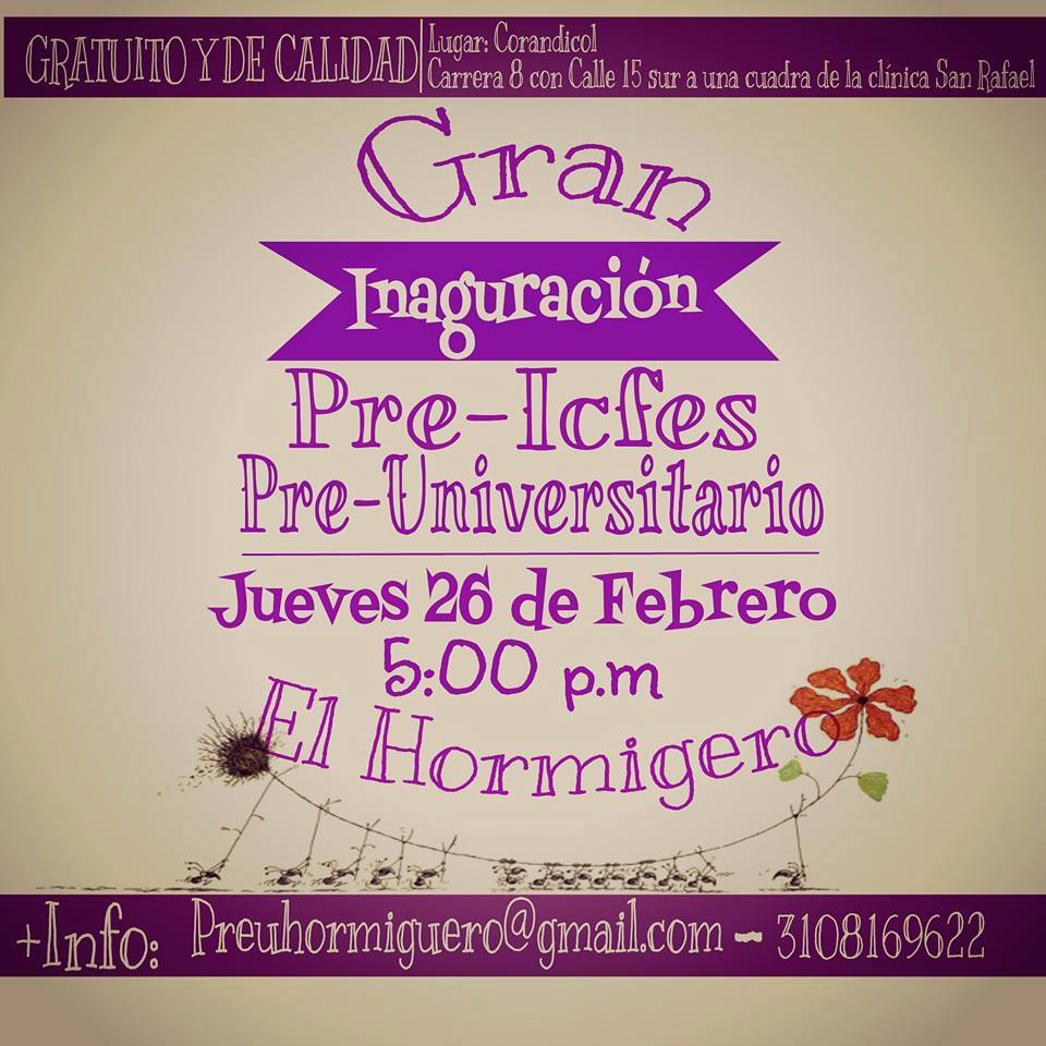 Inauguración del Pre Icfes y Pre Universitario Popular El Hormiguero febrero 18, 2015 · de cpeducacionpopularenlucha · en Uncategorized. · Comparte esto: Haz clic para compartir en X (Se abre en una ventana nueva) X Haz clic para compartir en Facebook (Se abre en una ventana nueva) Facebook Me gusta Cargando... Relacionado