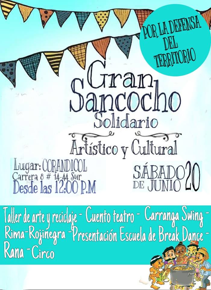 Por la «Defensa del Territorio» invitamos a un sancocho solidario que estará rodeado de actos artísticos y culturales de procesos sociales que hacen parte del espacio de CORANDICOL