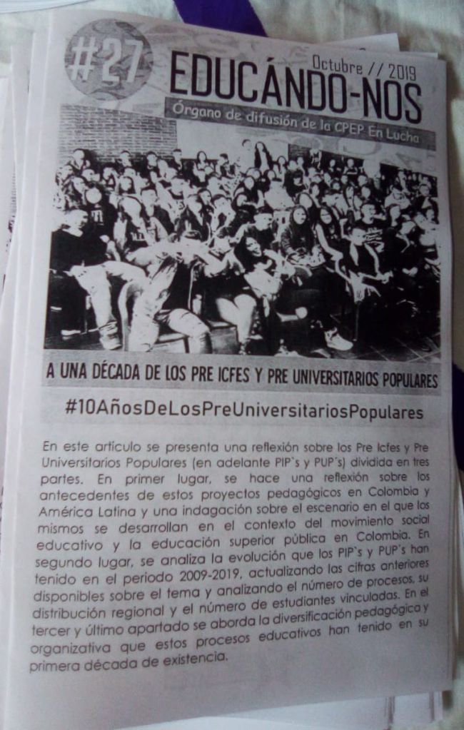 En las mismas se presentó una mesa de publicaciones con los números 26 y 27 del boletín Educando-nos órgano de difusión de la CPEP, las cartillas de sistematización de experiencias elaboradas por la Coordinadora sobre sus áreas de trabajo y la experiencia de la Escuela de Nuevas Educadoras Populares, las memorias del seminario sobre Paulo Freire entre el mito y el hito realizado por el Colectivo También El Viento, calcomanías sobre los 10 años de los pre universitarios populares y temas como feminismo, territorio y educación popular, así como la revista Aportes y libros de Dimensión Educativa.