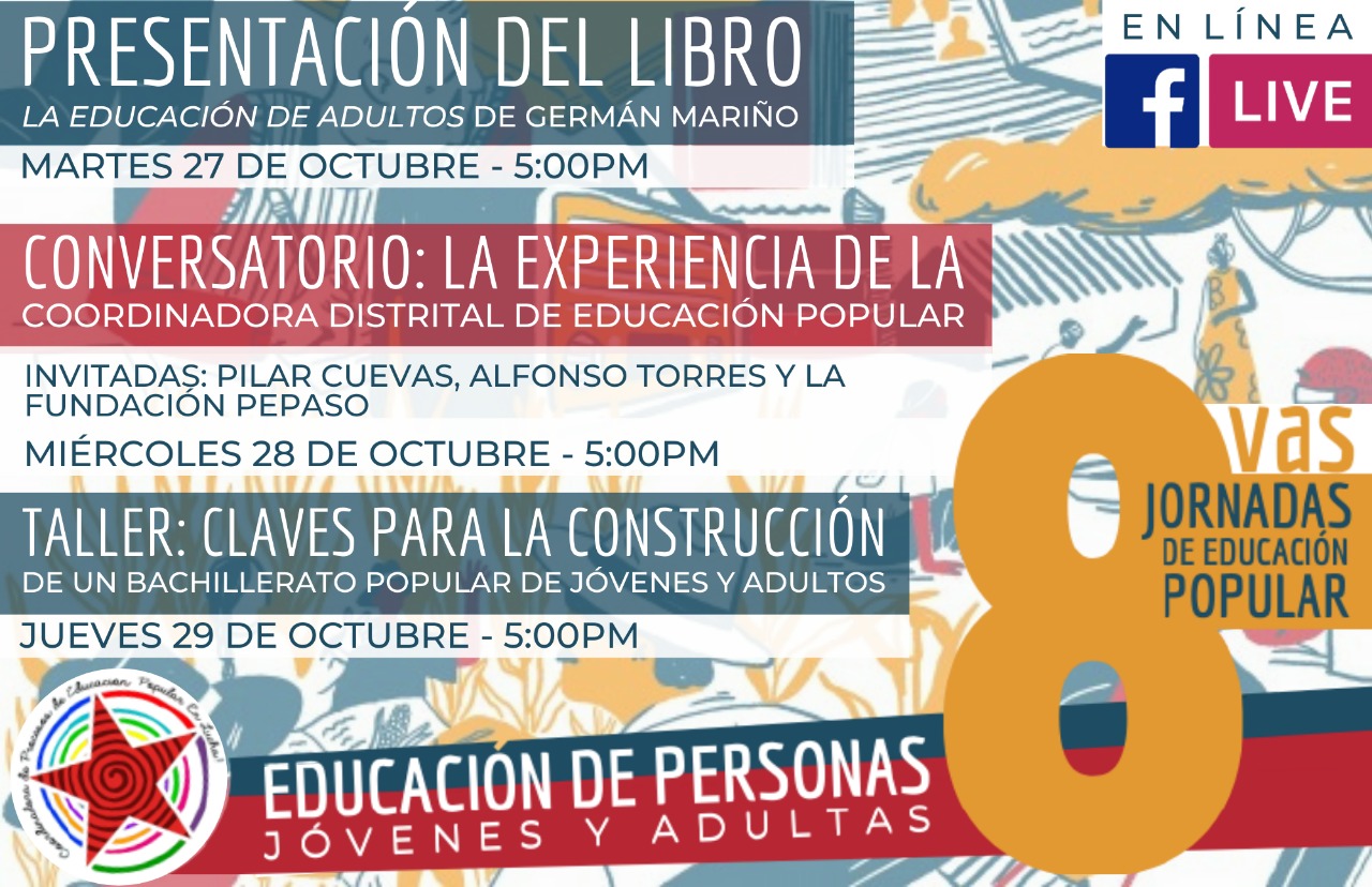Miércoles 28 de octubre. Conversatorio: La experiencia de la Coordinadora Distrital de Educación Popular de los 80s. Invitadas: Pilar Cuevas, Alfonso Torres y Fundación PEPASO. Desde las 5:00pm. Facebook Live