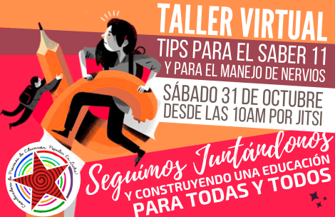 El sábado 7 y el domingo 8 de noviembre son las pruebas Saber 11, así que los Pre Icfes y Pre Universitarios Populares que hacemos parte de la Coordinadora De Procesos De EP En Lucha realizaremos este sábado, 31 de octubre, un taller virtual de tips para la prueba y de manejo de nervios. Así que les esperamos por Jitsi 📝