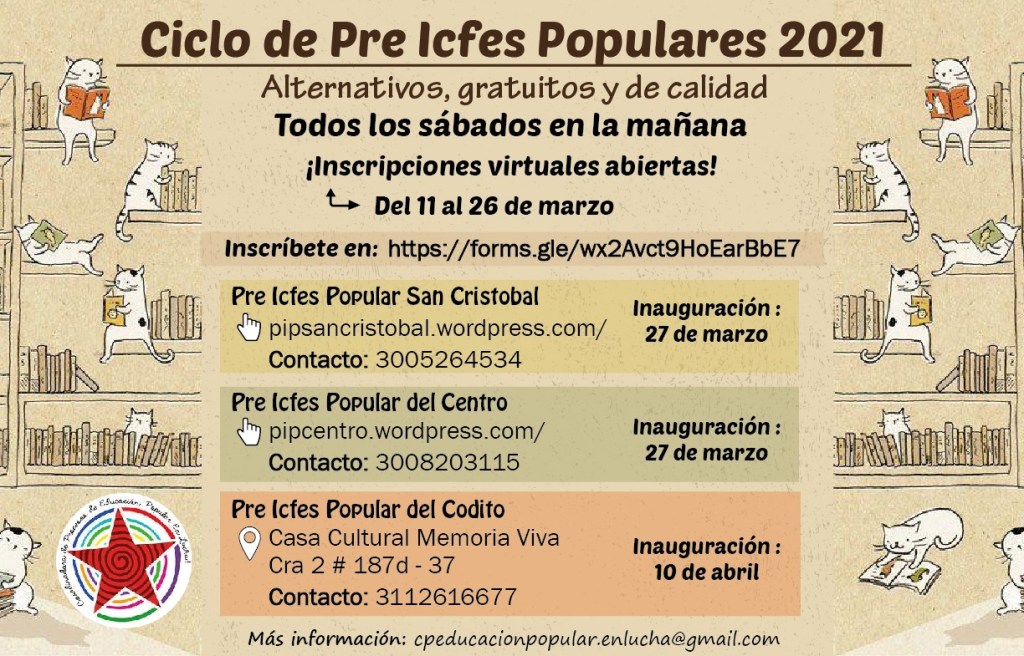 Pre Icfes Popular del Codito. Casa Cultural Memoria Viva (Cra 2 # 187 d-37) Contacto: 311 261 6677. Inauguración: 10 de abril