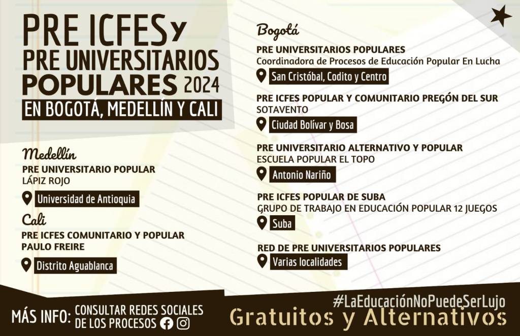 Si este año vas a presentar el examen Saber 11 y los exámenes de admisión a las universidades públicas, te presentamos un listado de Pre Icfes y Pre Universitarios Populares que son gratuitos y alternativos. Si vives en Bogotá, Medellín o Cali aquí puedes encontrar una buena opción para prepararte. 👆🏾