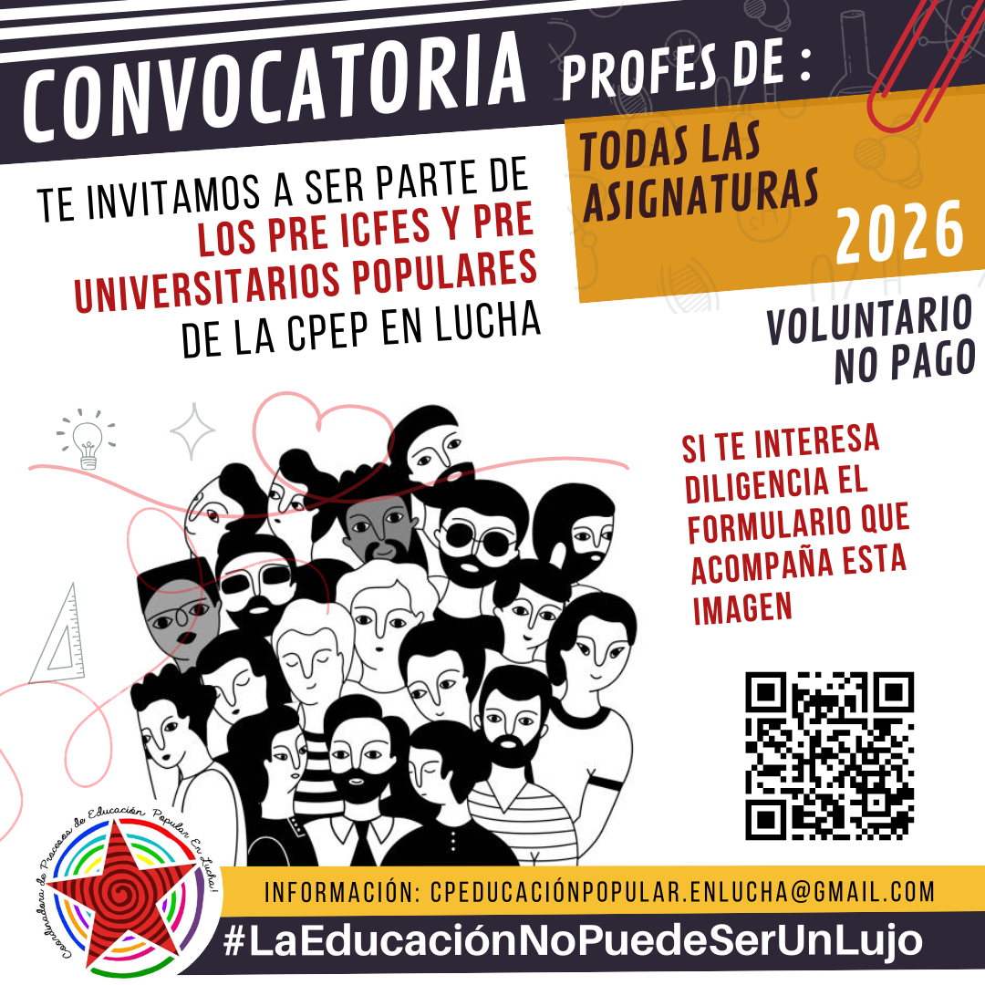 Ciencias Naturales, Sociales, Matemáticas, lectura crítica e Ingles (Voluntario, no pago). Te invitamos a ser parte de los Pre Icfes y Pre Universitarios Populares de la Coordinadora de Procesos de Educación Popular (CPEP) En Lucha. ✊🍃👇