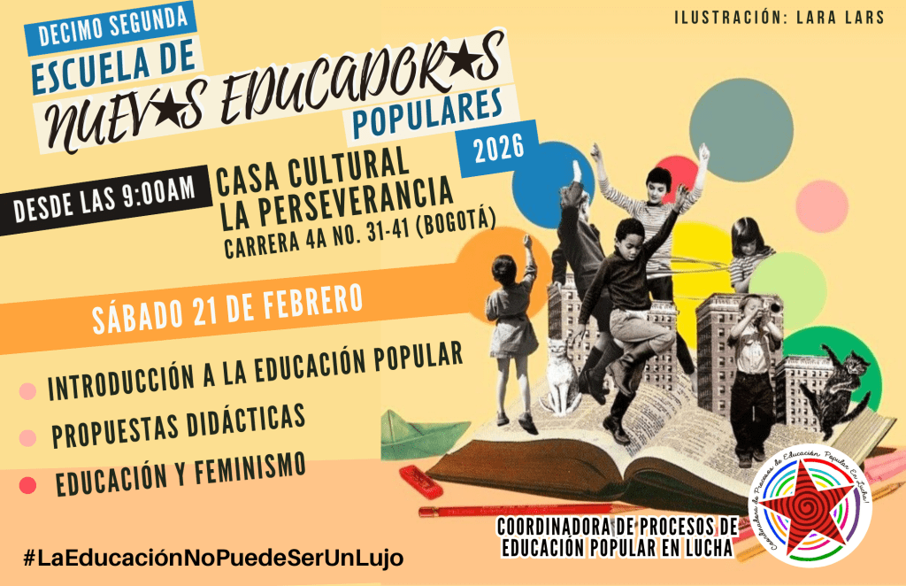 Decimo Segunda Escuela de Nuevas Educadoras Populares (ENEP) 2026 ✊🍃 febrero 15, 2026 · de cpeducacionpopularenlucha · en Convocatoria, Formación, Procesos, proximas-actividades. · Desde las 9:00 am.Casa Cultural La Perseverancia (Cra 4a No. 31-41) 🌱Sábado 21 de febrero Introducción a la educación popular Propuestas didácticas Educación y Feminismo Coordinadora de Procesos de Educación Popular (CPEP) En Lucha EducaciónPopularColombia CPEPEnLucha #ENEP #enep2026 Comparte esto: Compartir en X (Se abre en una ventana nueva) X Comparte en Facebook (Se abre en una ventana nueva) Facebook Me gusta Cargando... Relacionado