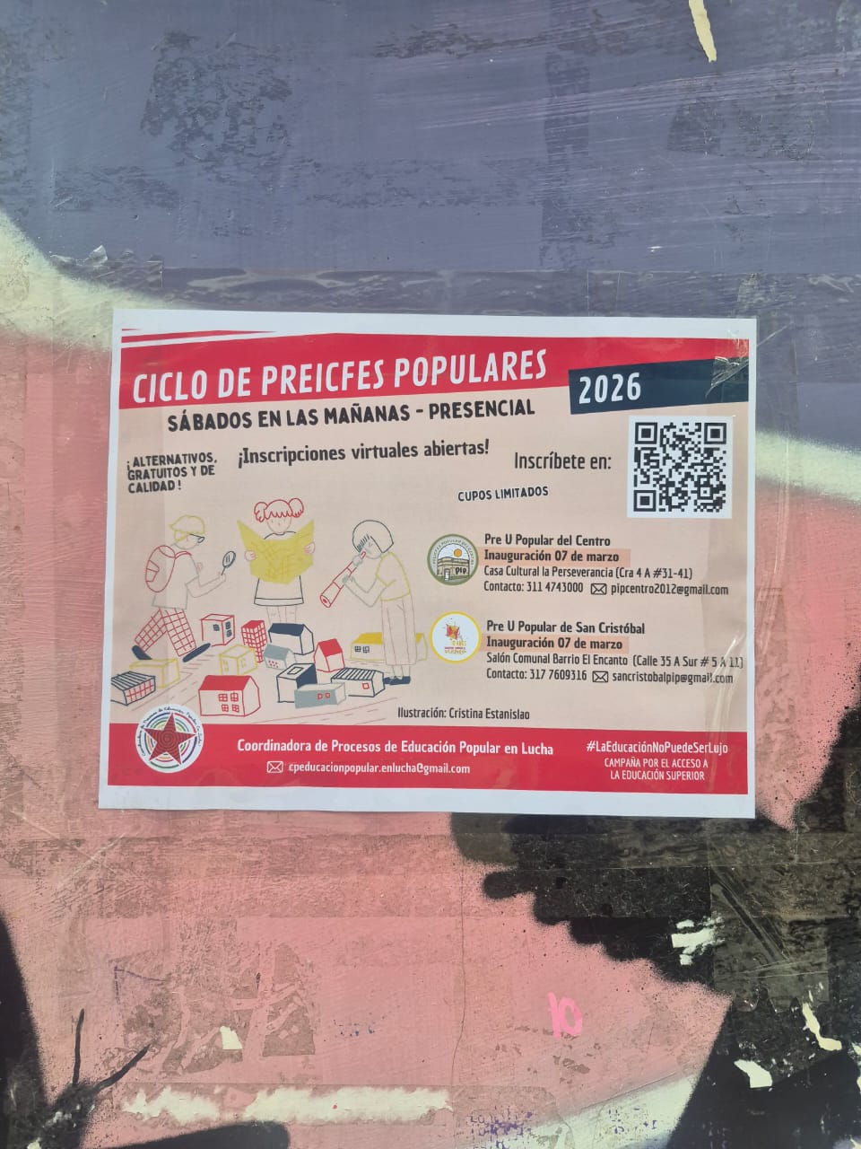 Compartimos imágenes de la jornada de pegado de la convocatoria al Ciclo de Pre ICFES Populares 2026, que realizamos en las localidades de Santa Fe y San Cristóbal, en Bogotá.