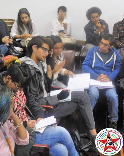 Después de la intervención de la compañera, la persona que estaba moderando presenta el segundo momento de la sesión. La idea es que a partir del trabajo por grupos, se analice, utilizando una matriz, algunos programas que se construyeron en dos experiencias de educación popular que hacen Pre Icfes y Pre Universitarios Populares. Así, se conforman seis grupos que trabajan, durante 40 minutos, en analizar un programa identificando objetivos, contenidos y competencias, estrategias metodológicas y textos y material de apoyo; a la par, cada grupo, tenía que responder a las siguientes preguntas: ¿Qué concepción del lenguaje, las ciencias sociales, la física o las matemáticas pueden identificarse en el programa?, ¿esa concepción es coherente con la noción de Educación Popular?, ¿que cambiarían del programa?